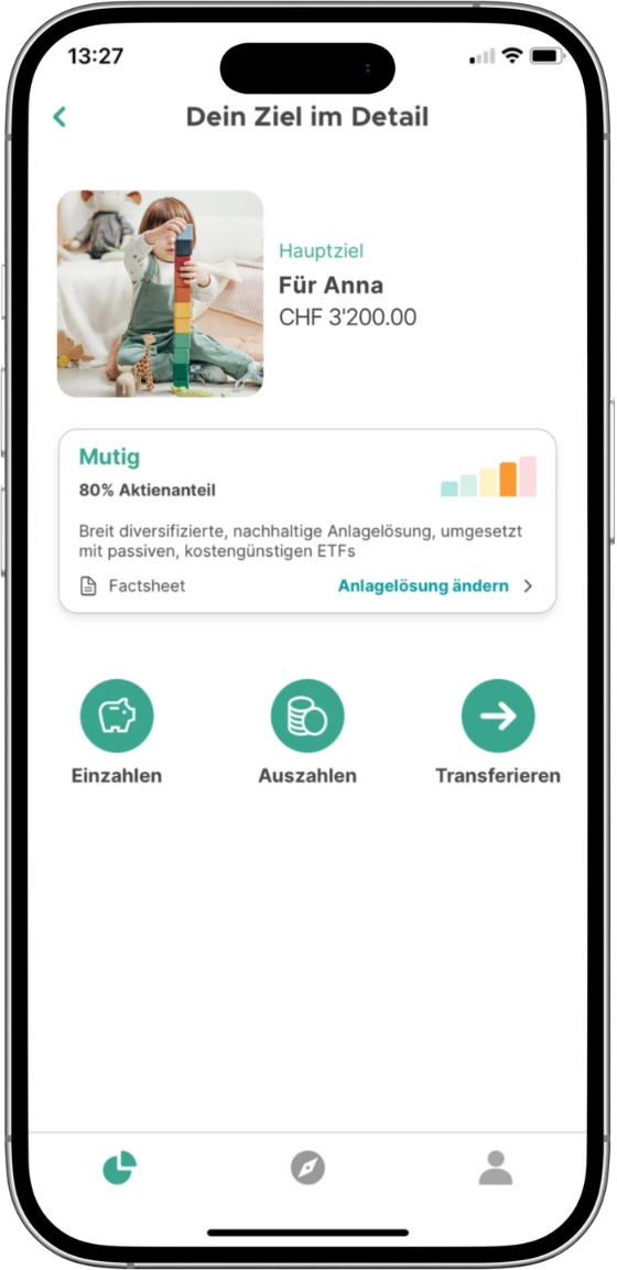 Du möchtest für deinen Nachwuchs, dein Gotti-, Götti- oder Enkelkind ein Polster schaffen, damit es später mit Rückenwind ins Erwachsenenleben starten kann? Ob als Zustupf für das erste Auto, die eigene Wohnung oder eine unvergessliche Weltreise – mit unseren Anlagelösungen aus kostengünstigen ETFs macht Sparen für die nächste Generation einfach mehr Sinn als auf einem mickrigen Sparkonto.