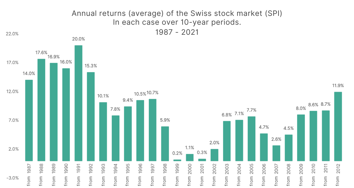 The calculations are based on the assumption that the return is 5% per year and is achieved regularly and at a constant level from the first year of investment. In reality, your investment will generate a net average annual return of around 5% over 10 years. However, there will be years with negative returns and then there will also be very good years. For example, the largest annual loss ever recorded in the Swiss stock market (Swiss Performance Index SPI) was -34% (2008), while the largest annual gain was +55% (1997).