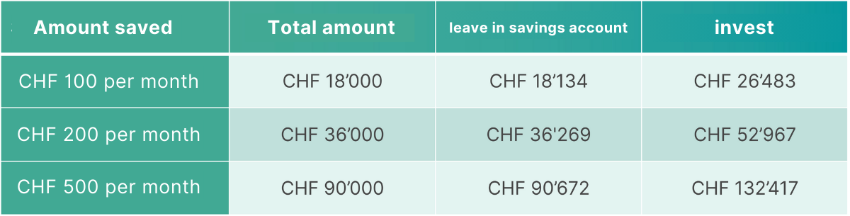 In the following table, we compare monthly investments of 100, 200 and 500 francs with savings in a savings account over an investment period of 15 years.