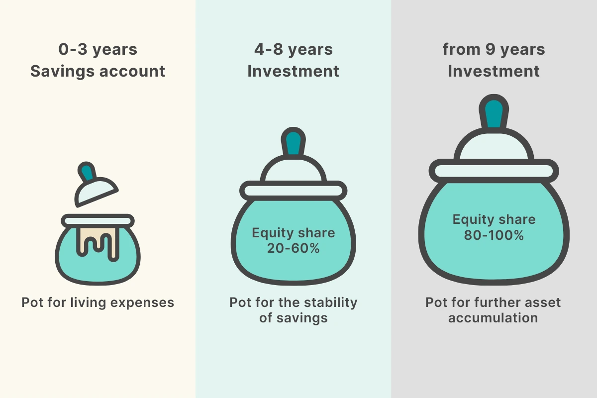 In most cases, you don’t need immediate and full access to all your pension fund money. Therefore, divide the assets based on time horizons and choose individual investment strategies. For the portion that should be available in the medium term, a more conservative investment strategy is recommended. For the medium to long-term portion, you can choose an equity allocation of 60% or even more.
