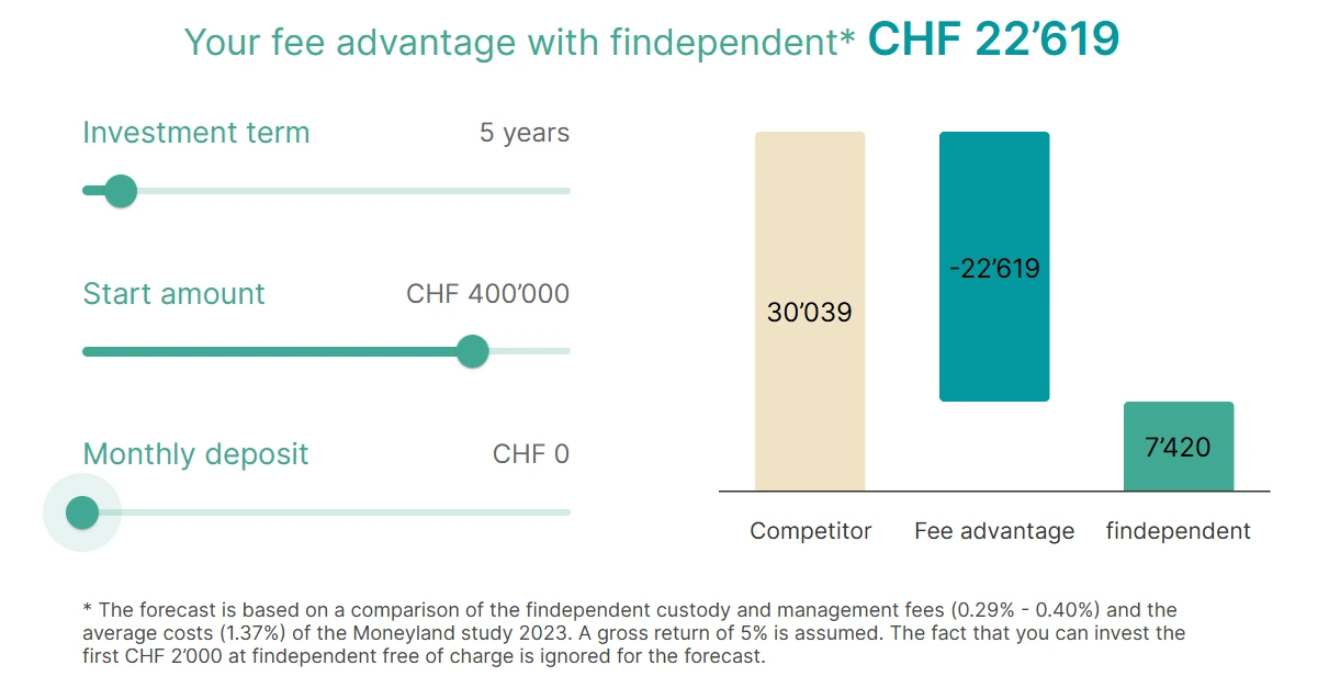 Even seemingly small percentage fees make a significant difference. With an affordable provider like findependent, you can save thousands of francs in fees compared to a traditional bank solution.