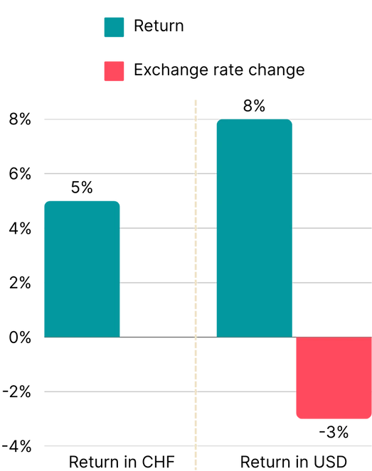 The Swiss franc is hugely important to us; we pay practically all our obligations in this country in our national currency. The situation is somewhat different in a global context, where the Swiss franc plays a rather subordinate role. Many global investments are calculated in US dollars. If you make such investments, there is an exchange rate risk. A return in a foreign currency must be adjusted for the change in the exchange rate in order to obtain a return in Swiss francs.
