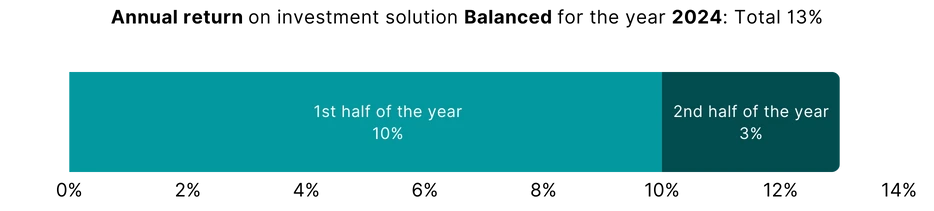 The findependent investment solution “Balanced” achieved a total return of 13% in 2024, after deduction of all costs. 10% was generated in the first half of the year and 3% in the second half.
