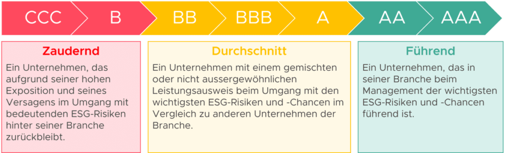 Für unser ESG-Screening nutzen wir die Analysen von MSCI, welche Geschäftsaktivitäten, Unternehmensgrösse und Standorte der Tätigkeiten eines Unternehmens umfassen. MSCI analysiert, welchen ESG-Risiken ein Unternehmen ausgesetzt ist, wie es diese Risiken managt und wie es im Vergleich zu anderen Unternehmen in derselben Branche abschneidet. Dazu erhalten sie ein Rating von «CCC» (Nachzügler) bis «AAA» (Spitzenreiter).