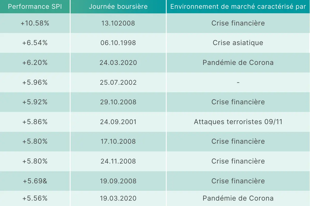 Les 10 meilleures journées boursières du marché suisse des actions, mesurées par la performance du Swiss Performance Index (SPI) par rapport à la journée boursière précédente, sur la période du 01.01.1992 au 30.06.2022