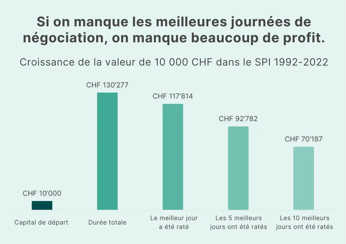 En théorie, il serait bien sûr extrêmement intéressant de vendre ses placements lorsque les cours sont au plus haut et de les réintégrer plus tard, lorsque les cours sont arrivés au plus bas. Mais il est pratiquement impossible d’identifier ces moments dans le présent. En effet, comme nous l’avons dit, les marchés n’évoluent souvent pas comme prévu.
