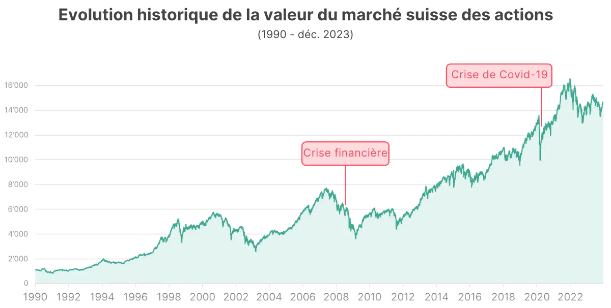 Peu importe quand, combien de temps et avec quelle intensité les marchés financiers ont été secoués jusqu’à présent, chaque crise a toujours été suivie d’une reprise. Un regard sur le passé le montre. Voici, à titre d’exemple, l’évolution historique de la valeur du marché suisse des actions.