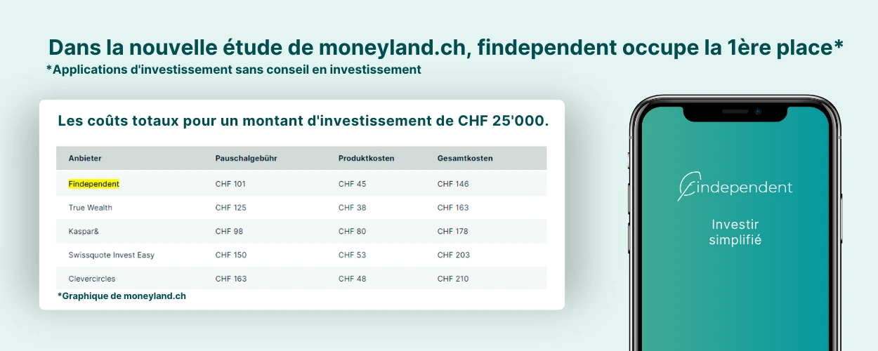 L’un des facteurs les plus importants dans l’investissement passif est le coût. C’est pourquoi tu devrais choisir l’application de placement la moins chère, sans faire de compromis sur la qualité et la sécurité. Selon une étude du portail de comparaison Moneyland, l’application d’investissement de findependent est considérée comme l’application la moins chère de Suisse. On peut donc dire, sous cet angle : findependent est la meilleure application pour un investissement passif.