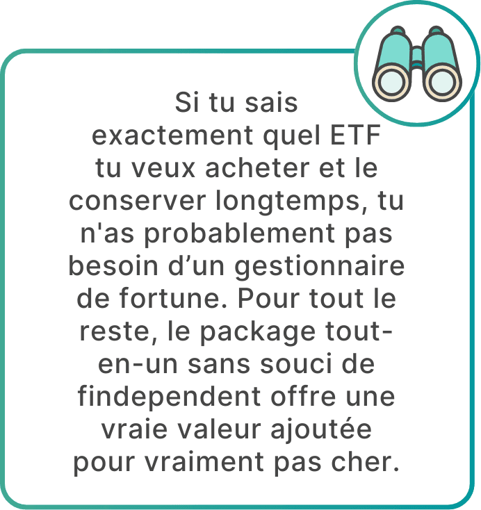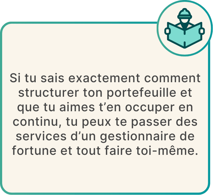 Nous répondons à ces questions dans cet article et te fournissons des éléments pour t’aider à prendre ta décision. Pour que tout reste clair, nous avons comparé directement les deux options en fonction de tous les critères pertinents, à gauche le « do-it-yourself » et à droite la délégation à un gestionnaire de patrimoine.