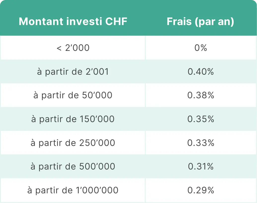 De plus, les premiers CHF 2’000 sont gratuits à vie pour tous. Convaincs-toi par toi-même en toute tranquillité et commence à partir de CHF 500.