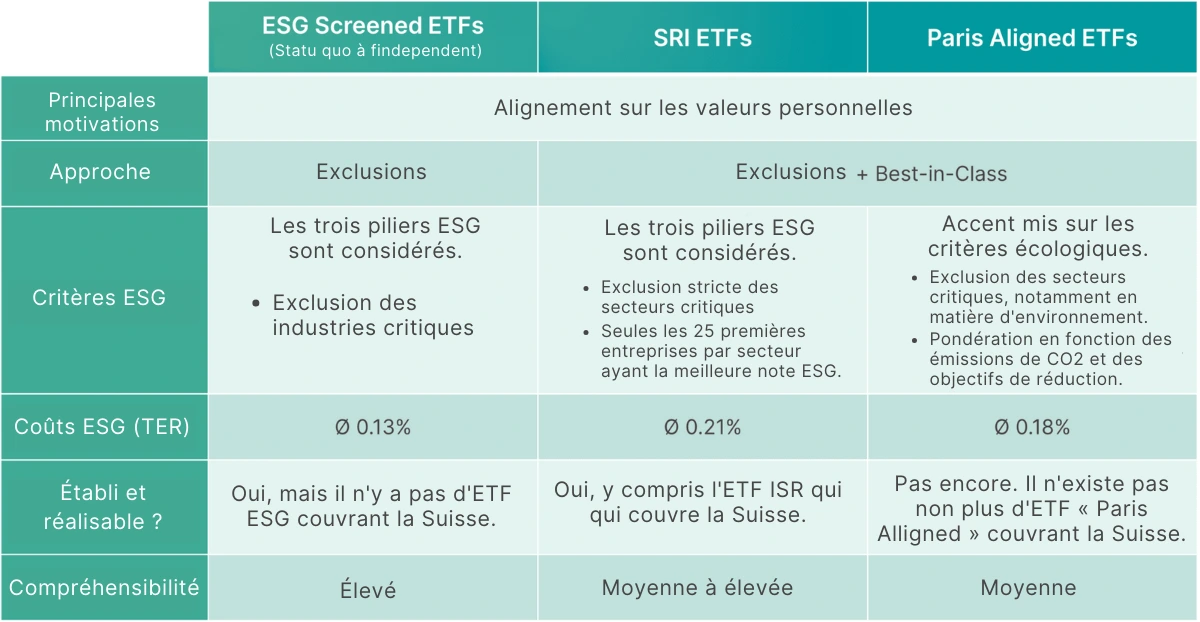 Les ETF Paris Aligned sont fortement axés sur le climat. En revanche, ils n’appliquent que peu d’exclusions basées sur la valeur, ce qui permet d’inclure des entreprises actives dans le domaine des armes civiles, du nucléaire ou de l’alcool. Grâce à la procédure de sélection relativement compliquée, y compris la pondération, un Paris Aligned ETF contient au total environ 50% des entreprises d’un ETF « normal ». De ce fait, la tracking error et le turn over sont moyens. L’inconvénient des ETF alignés sur Paris est qu’ils sont relativement nouveaux et ne sont donc pas encore établis. Cela signifie que les spreads de négociation sont encore un peu élevés et qu’il existe un risque potentiel que les ETF soient à nouveau retirés du marché. Chez findependent, nous ne proposons donc pas actuellement d’ETFs alignés sur Paris, mais nous observons leur évolution. Par ailleurs, il n’y a pas encore d’ETF Paris Aligned couvrant le marché suisse des actions. En termes de coûts, ils se situent entre les ESG Screened ETFs, moins chers, et les SRI ETFs, plus onéreux.