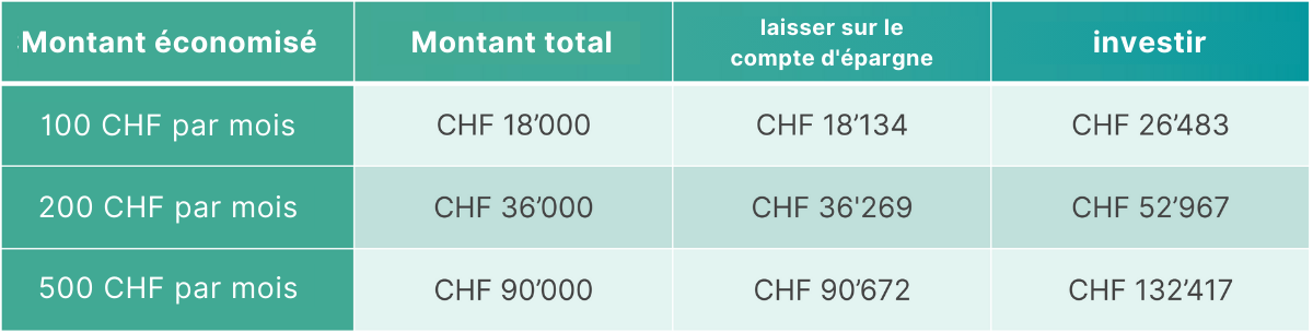 Mais si tu peux économiser un peu d’argent, cela vaut la peine de l’investir, même pour de petits montants ! Nous allons te le montrer tout de suite avec un exemple de calcul.