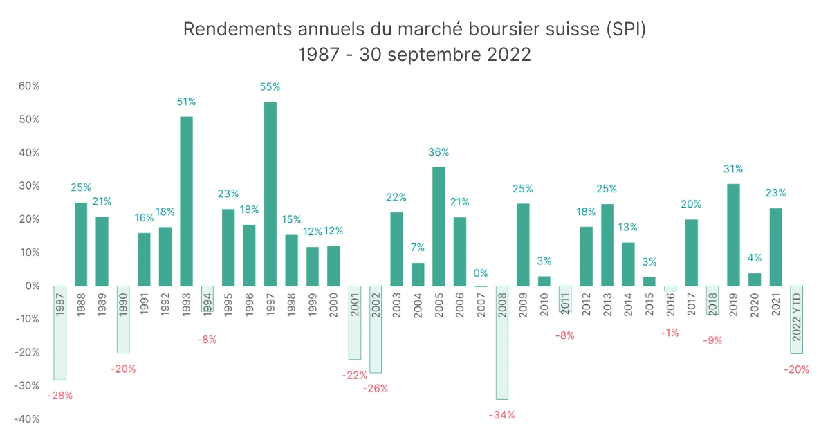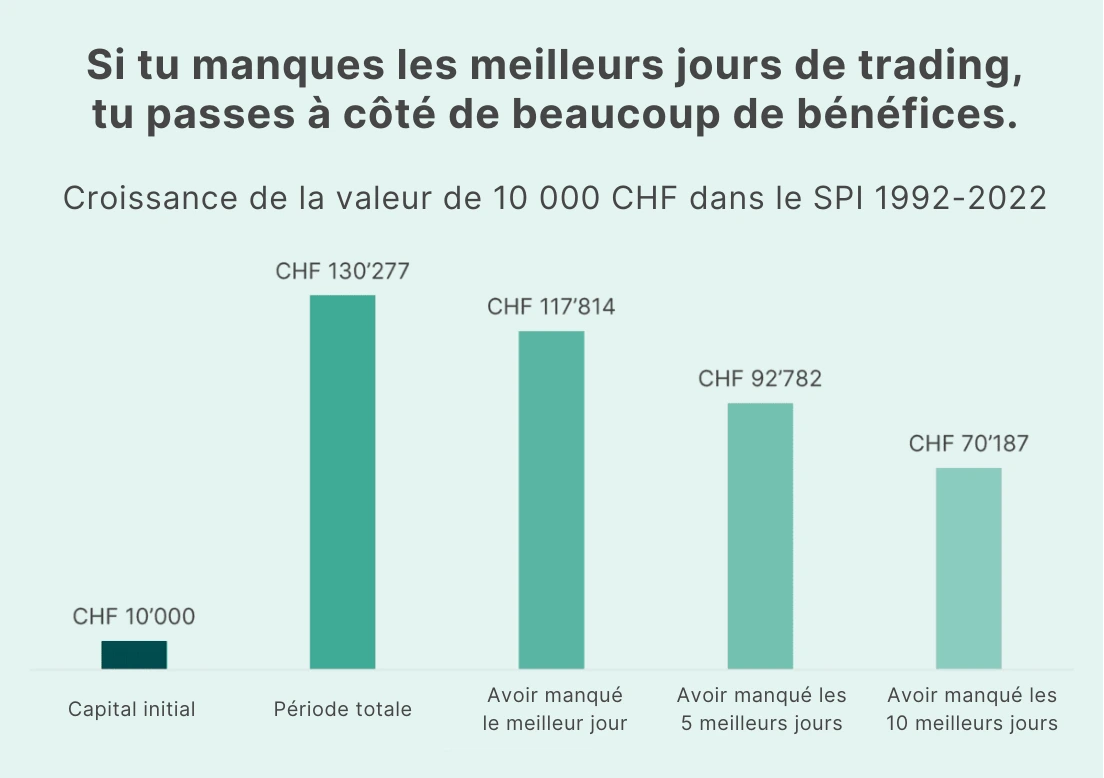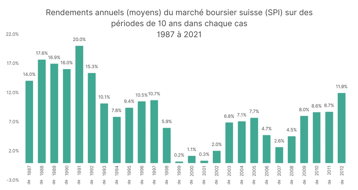 Les calculs sont basés sur l’hypothèse que le rendement est de 5 % par an et qu’il est obtenu de manière régulière et constante à partir de la première année d’investissement. En réalité, ton investissement générera un rendement annuel moyen net d’environ 5 % sur 10 ans. Cependant, il y aura des années avec des rendements négatifs, tout comme des années très bonnes. Par exemple, la plus grande perte annuelle jamais enregistrée sur le marché boursier suisse (Swiss Performance Index SPI) était de -34 % en 2008, tandis que le plus grand gain annuel a été de +55 % en 1997.