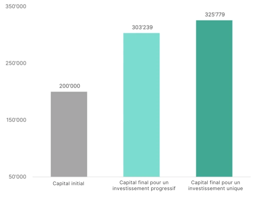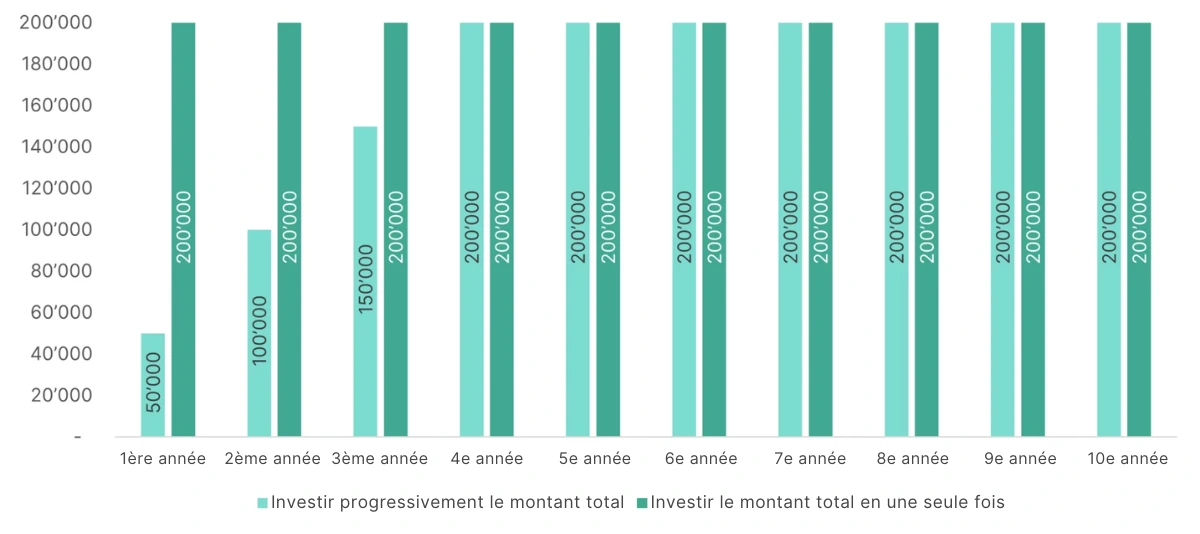 Avec un investissement unique, ton capital entier est investi pendant toute la durée de l’investissement. Dans cet exemple, cela représente 200 000 francs. Avec l’investissement progressif, on investit 50 000 francs chaque année pendant les quatre premières années.
