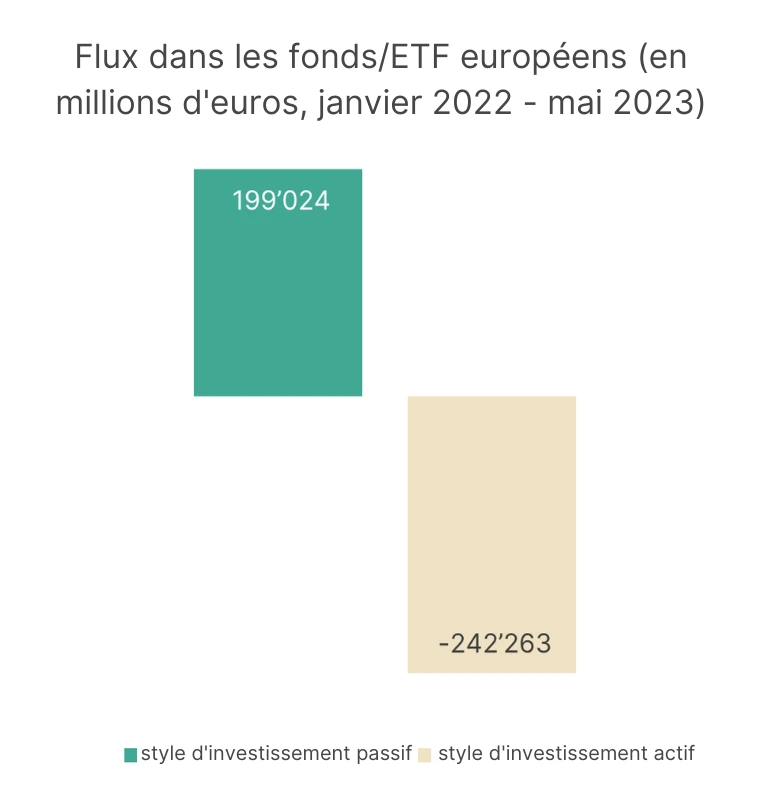 La tendance se poursuit depuis un certain temps déjà. Depuis le début de l’année 2022, près de 200 milliards d’euros ont été investis dans des styles de gestion passifs, contre plus de 240 milliards d’euros de sorties de stratégies actives.
