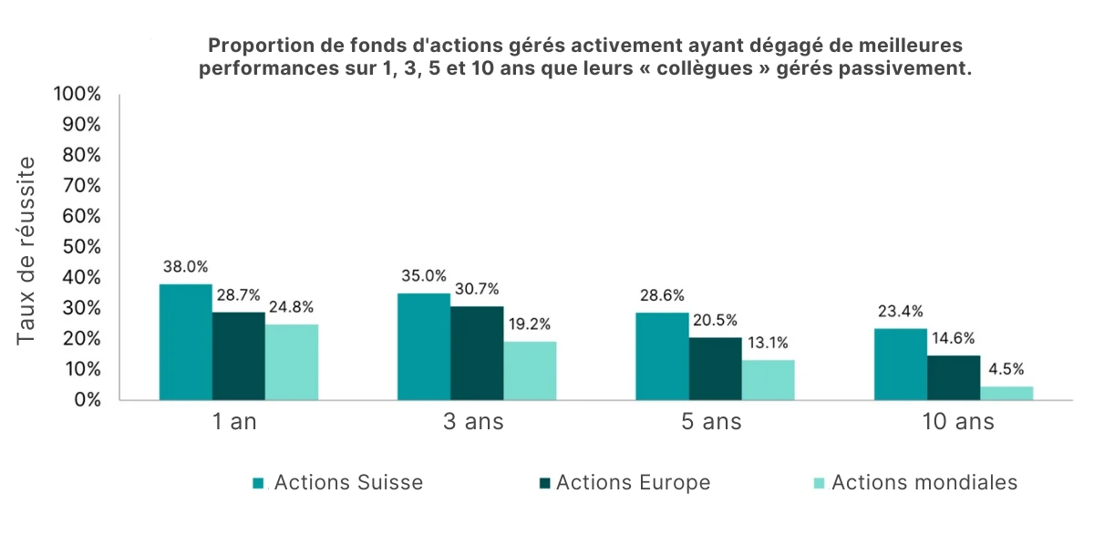 Même pour les fonds d’actions purs, le bilan est plutôt décevant. A court terme, au moins 30% des fonds parviennent à convaincre, mais après plusieurs années déjà, le taux de réussite diminue et se situe à un maigre 4,5% pour les fonds d’actions mondiaux sur 10 ans. En d’autres termes, 95 fonds sur 100 gérés activement offrent un rendement inférieur à celui des fonds gérés passivement.