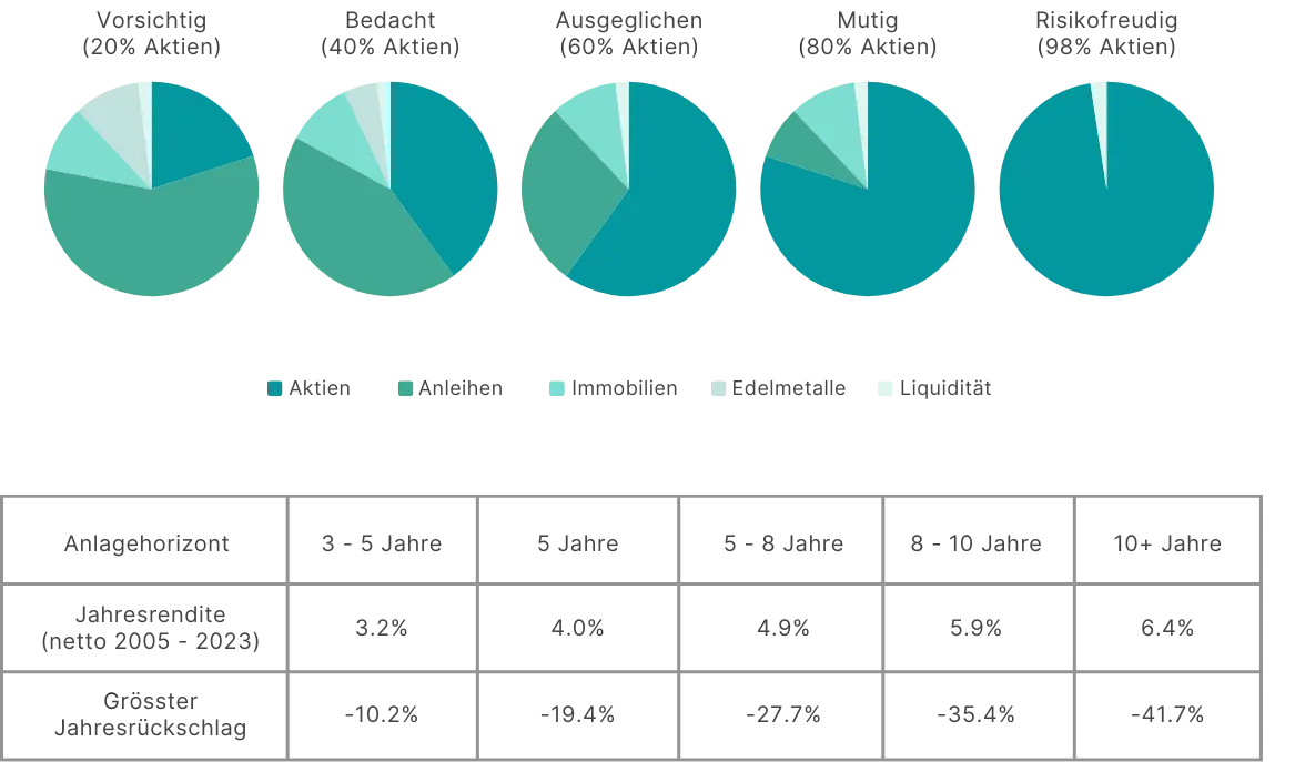 Anlagestrategien unterscheiden sich in puncto Anlagedauer, Wertschwankungen und zu erwartender sowie historischer Rendite. Für die findependent Anlagelösungen sieht dies folgendermassen aus: