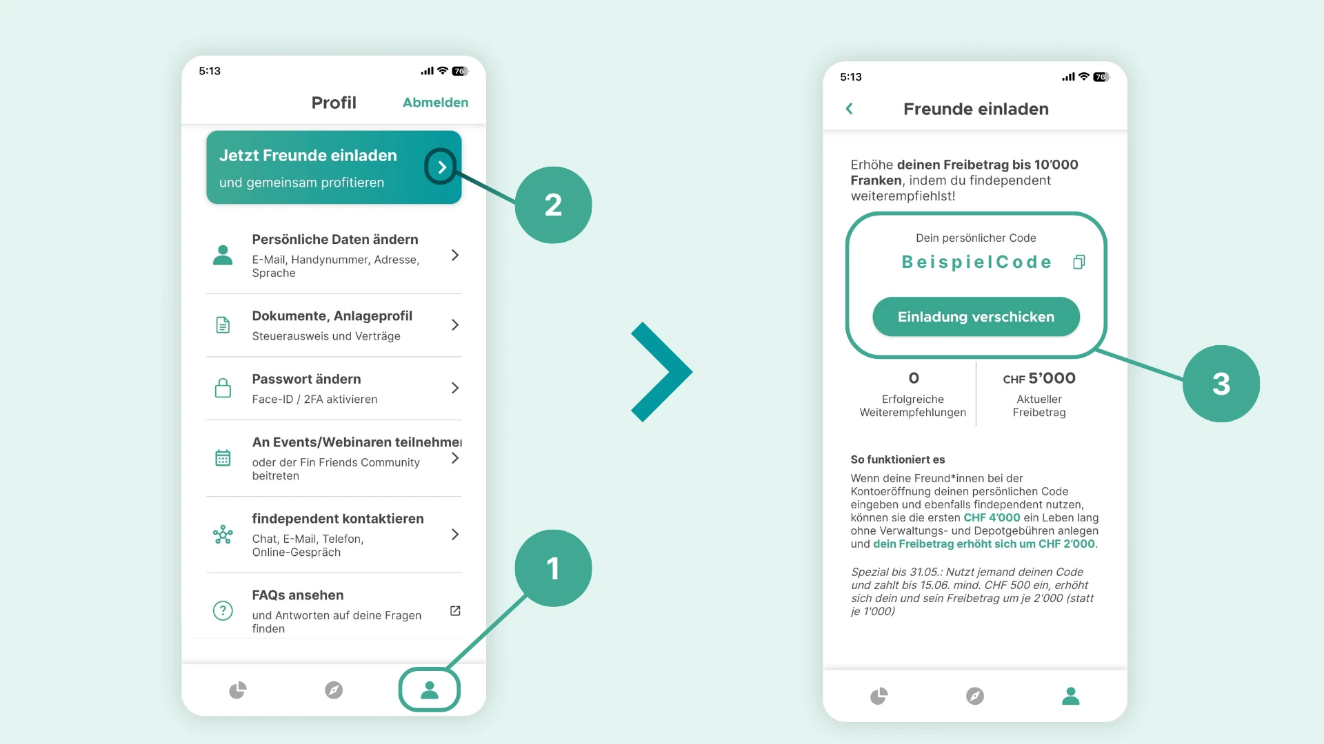 Dazu müssen sie bis zum 30. Juni 2025 mit deinem persönlichen Code ihre Registrierung abschliessen und bis zum 15. Juli 2025 mind. CHF 500 mit findependent anlegen.