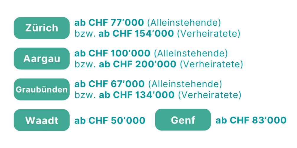 Hier eine Übersicht einiger Kantone (Stand Mai 2024). Ab diesen Vermögenshöhen fallen Vermögenssteuern an: